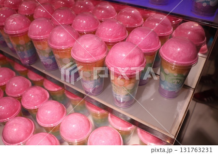 虹色に輝くレインボーデザートカップとピンク綿菓子ドーム