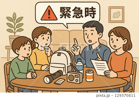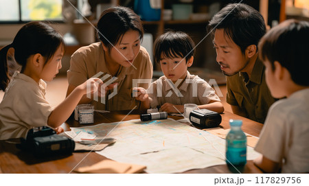 家族で備える防災対策, 災害時に備えた家族の備蓄チェック, 家族で確認!防災グッズの準備風景