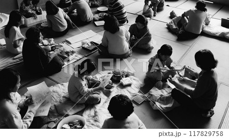 避難所での共同生活 - 災害時の避難と支え合いのモノクロ写真