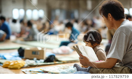 避難所で本を読む親子 - 災害時の避難生活と家族の絆