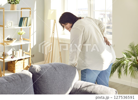 Overweight young woman suffering from chronic back pain