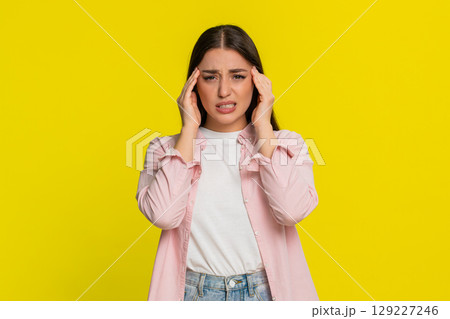 Woman sighing holding hand on head showing painful expression suffering from headache discomfort