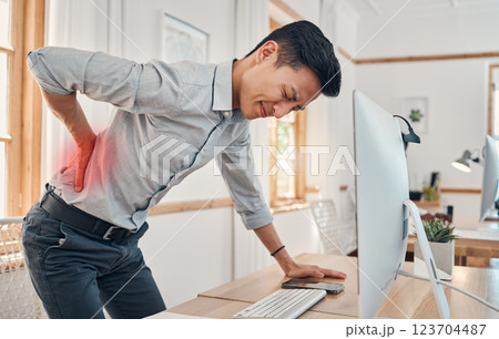 Businessman with back pain, muscle injury and burnout at office desk. Young frustrated man suffering from spinal inflammation, body discomfort or strain and healthcare stress emergency