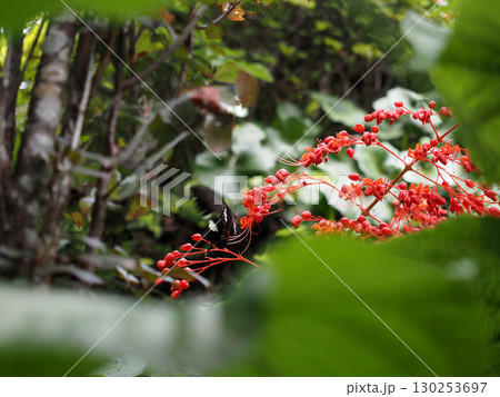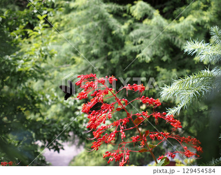 ヒギリにとまって蜜を吸うクロアゲハ(真っ赤な花と黒いアゲハチョウ)