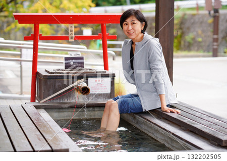 小安峡総合案内所の足湯に入る女性