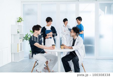 複数のドクターや研究者のイメージの横並びで歩くところ、未来や希望がある明るいイメージ コピースペース