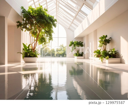 都市の中の癒し、観葉植物と水辺が調和するインテリア
