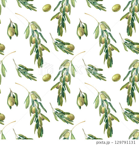 Seamless pattern with green olive branches, leaves and berries. Watercolor hand drown isolated on white background pattern for textile, fabric, packaging design