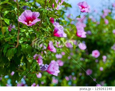 Syrian hibiscus flower (Hibiscus syriacus), also known as Rose of Sharon. Vibrant pink hibiscus flowers in lush green garden setting