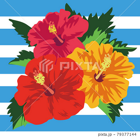 水色のボーダーバックの鮮やかな三輪のハイビスカスの花と葉のイラスト