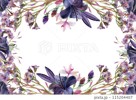 Hand drawn watercolor illustration botanical flowers leaves. Lily clivia amaryllis, bergenia heliotrope lungwort, pink lobelia jasmine, willow eucalyptus. Frame isolated white. Design wedding, cards