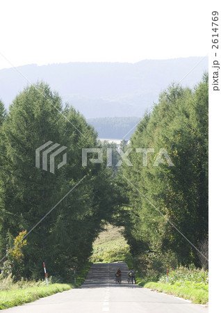 美瑛の坂道で自転車を押す二人 緑のトンネル