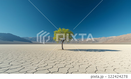 強い日差しと砂漠に映える一本の緑の木のミニ.