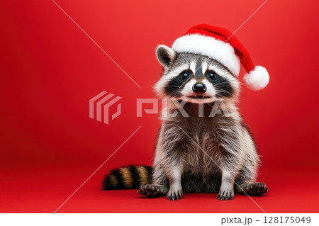 A raccoon wearing a Santa hat is sitting on a red background