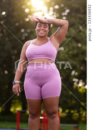 Woman Exercising Outdoors on Yoga Mat with Laptop in Park Setting for Fitness and Wellness Inspiration