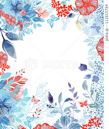 Frame with blue and red flowers. hand drawing. Not AI, Vector illustration