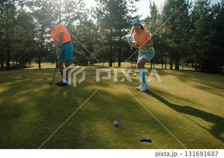 Golfers practice putting on a sunny afternoon at a picturesque golf course surrounded by trees and lush greenery
