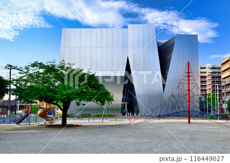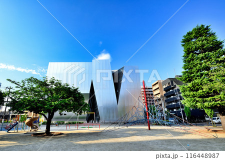 東京都墨田区にあるすみだ北斎美術館と緑町公園の風景