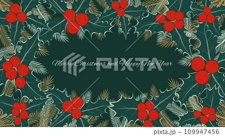Holiday card with greetings Merry Christmas and Happy New Year in traditional green and red colors. Holly vector illustration.