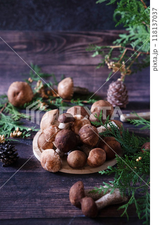 Basket with edible white mushrooms. Boletus edulis. Collect porcini in forest