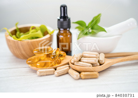 Herbal medicine capsules on white background