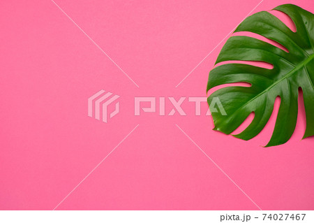 Tropical monstera leaf on a neon pink summer background, banner, space for text, flat lay