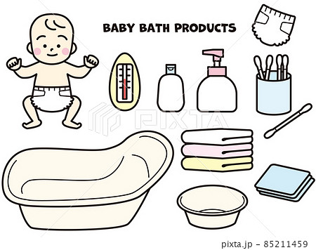 新生児に使うベビーグッズのイラストセット(線あり3色)