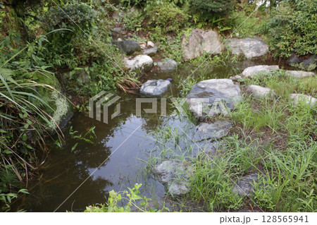 集中豪雨明の農家の庭