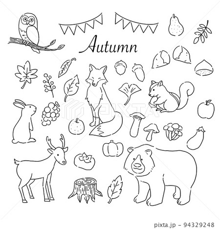 秋の森と動物たちのイラストセット 手描き線画