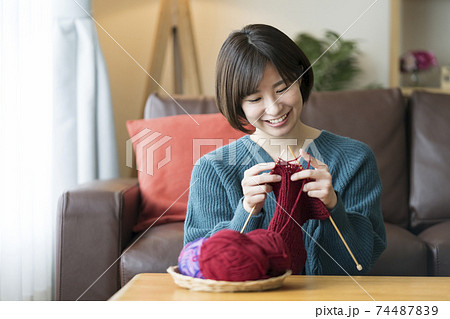 編み物をする若い女性