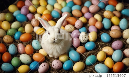 Charming easter bunny nestled in a woven basket amidst vibrant, hand painted eggs and fresh spring blooms, setting a joyous and lively easter atmosphere