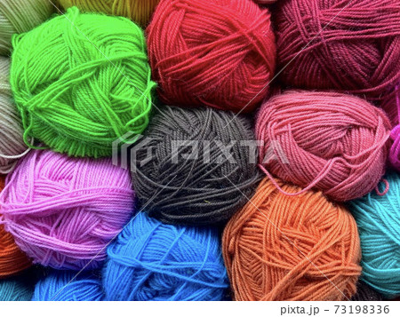 Tangles of thin acrylic yarn. Tightly stacked with a multicolored background.