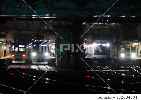 夜の東武スカイツリーライン西新井駅での緩急接続後の同時発車