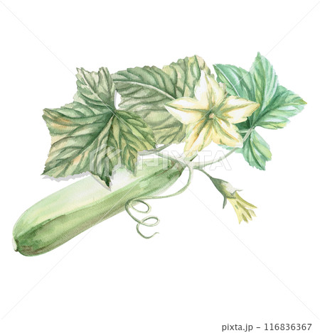 Zucchini with leaves and flowers. Hand-drawn illustration on the theme of harvest for agricultural fairs, harvest exhibitions, vegetable shops,cookery books. Illustration isolated from background.