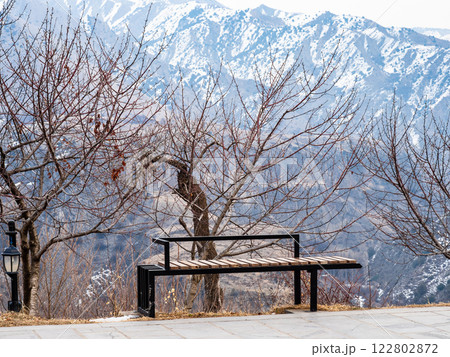 Bench in park with pine trees on sea coast of Italy, Liguria. Tourism and recreation. Nature and health.