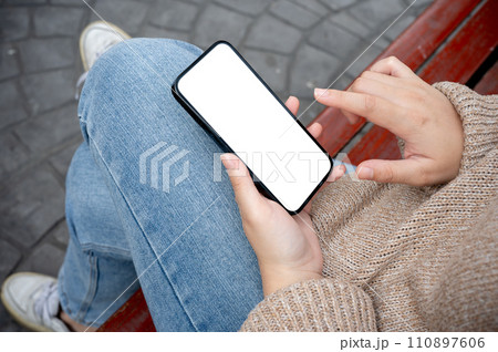 A woman in casual clothes is relaxing on a bench in a city park and using her smartphone.