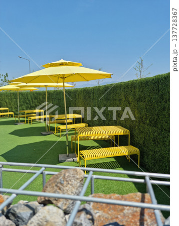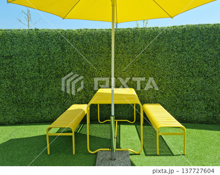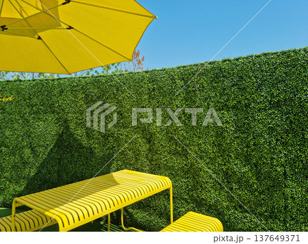 Artificial grass wall and parasol