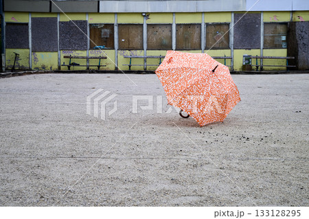 Orange umbrella open on ground