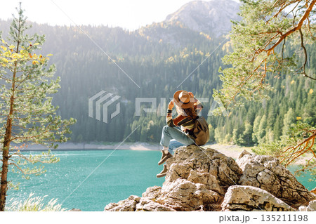Back view young woman with backpack looking the view of the mountain lake in sunny weather.