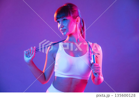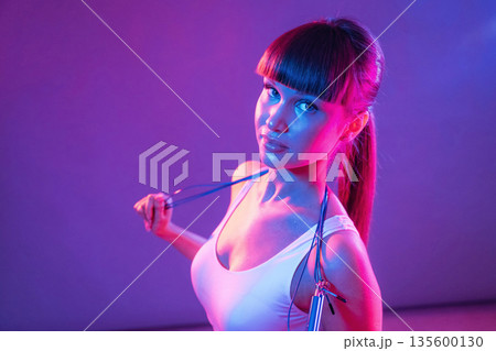 Jumping rope is in hands. Beautiful fitness woman is in the studio
