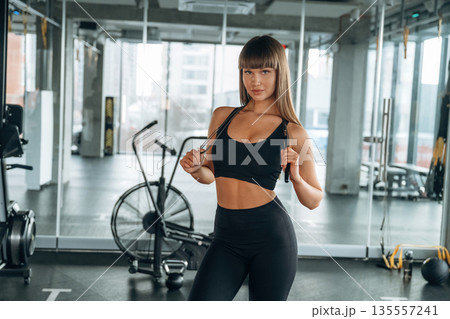 Jumping rope in hands and on the neck. Young woman is in the gym