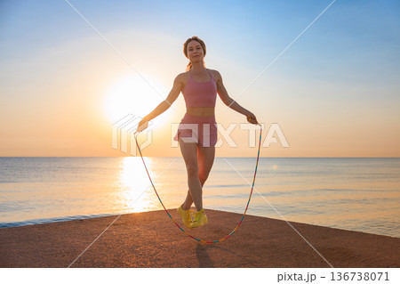 Fit woman jumping rope at the beach during vacation. Healthy lifestyle and summer sport concept