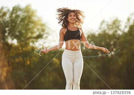 Jumping rope, active. Young fitness woman is on the field outdoors
