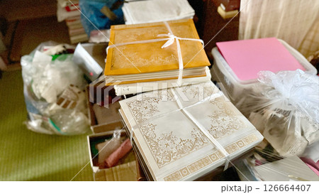 しばった写真アルバムと片付け中の部屋