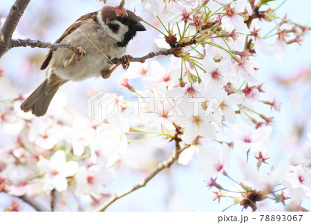 スズメが桜の花を背景にして桜の木の小枝にとまっている