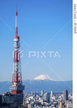 大都会東京のシンボルタワーと街並みと冠雪した富士山の眺望|東京イメージ|東京都