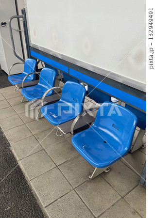 ホームの青いベンチ