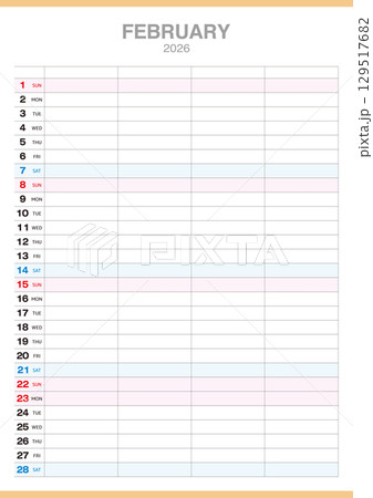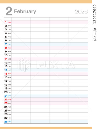 4人分の予定が書込み可能な2026年2月のカレンダーです。