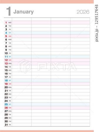 4人分の予定が書込み可能な2026年1月のカレンダーです。