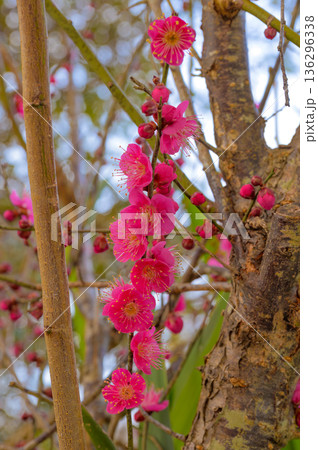 縦一列に美しく咲き並ぶ紅梅の花